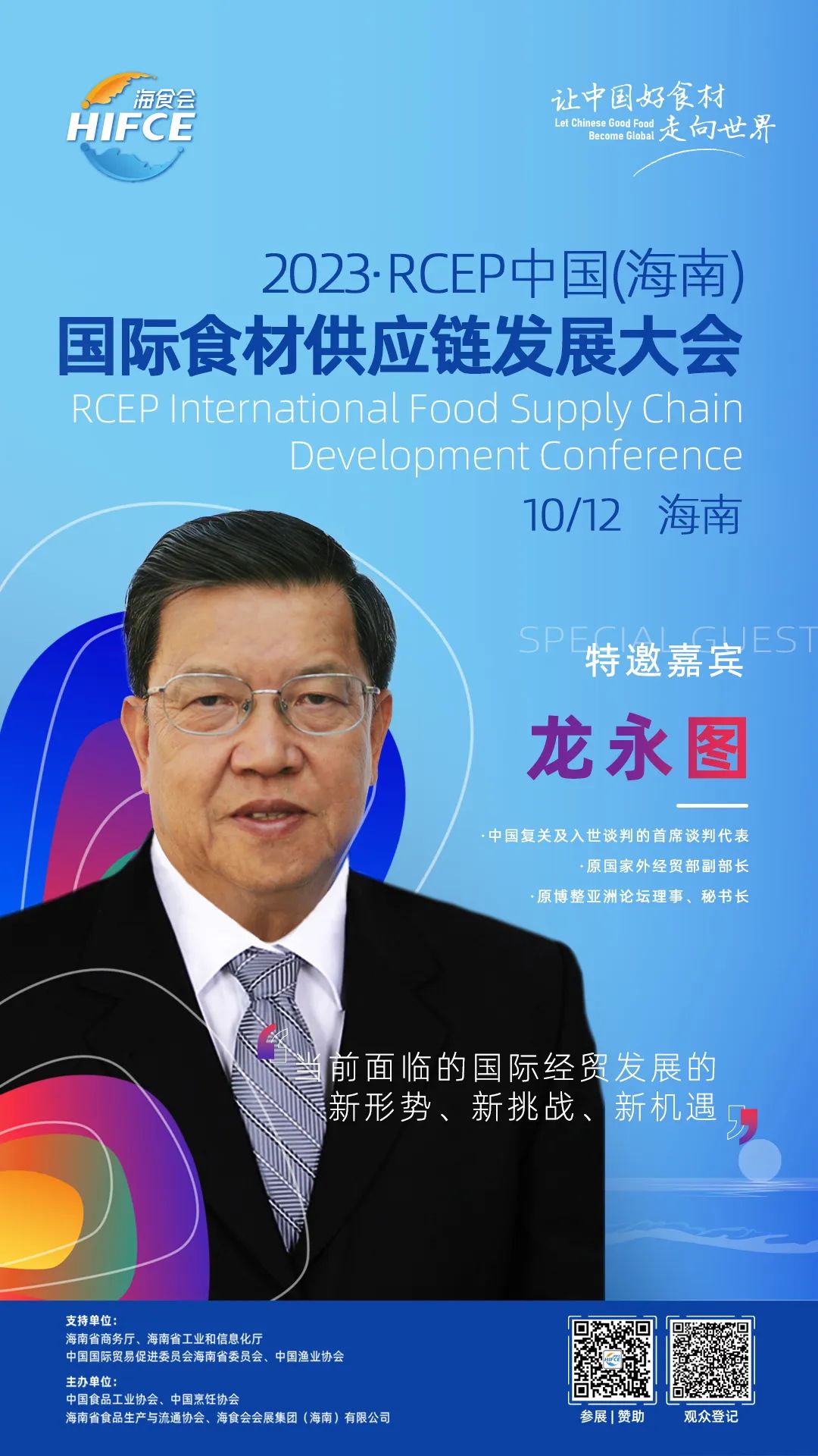 特邀嘉賓龍永圖將在現(xiàn)場帶來國際經(jīng)貿(mào)發(fā)展新形勢、新挑戰(zhàn)、新機(jī)遇主旨演講。